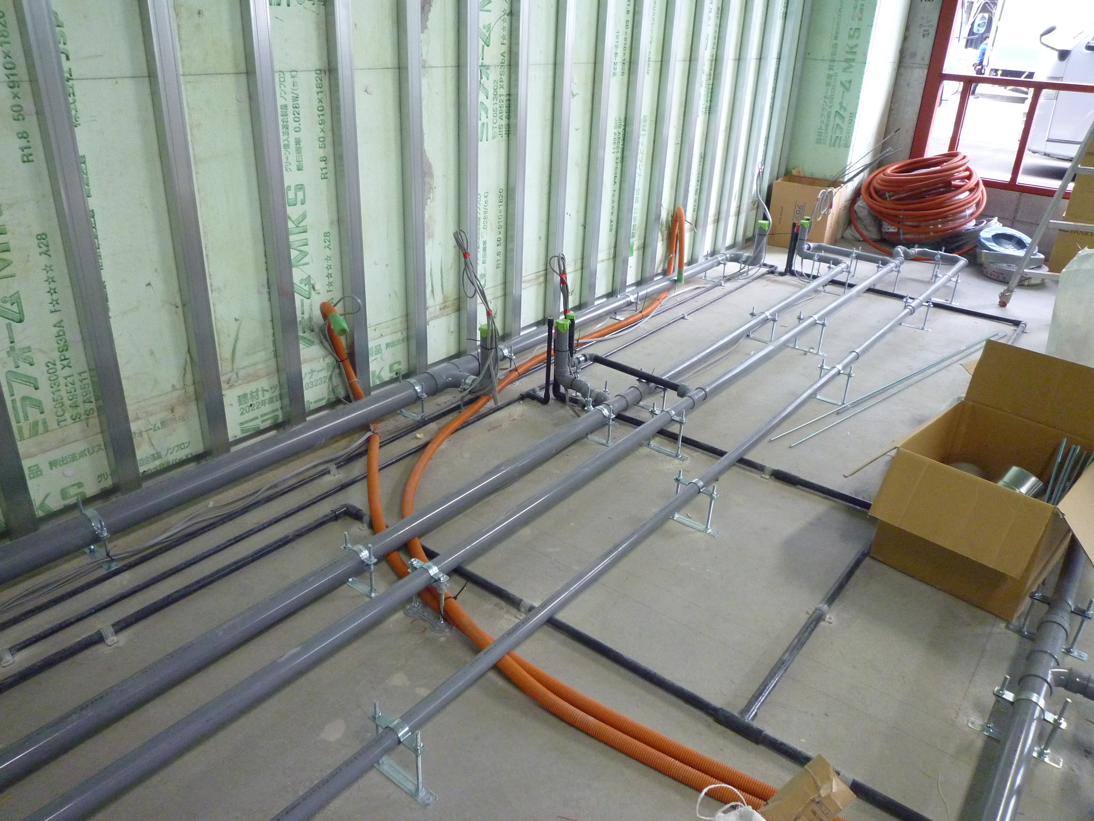 大阪市福島区で歯科クリニックの工事が順調に進んでおります。歯科診療チェアの下はこのような配管が巡らされております。1本1本立上げる位置が細かく指定されているので、墨出しをして
