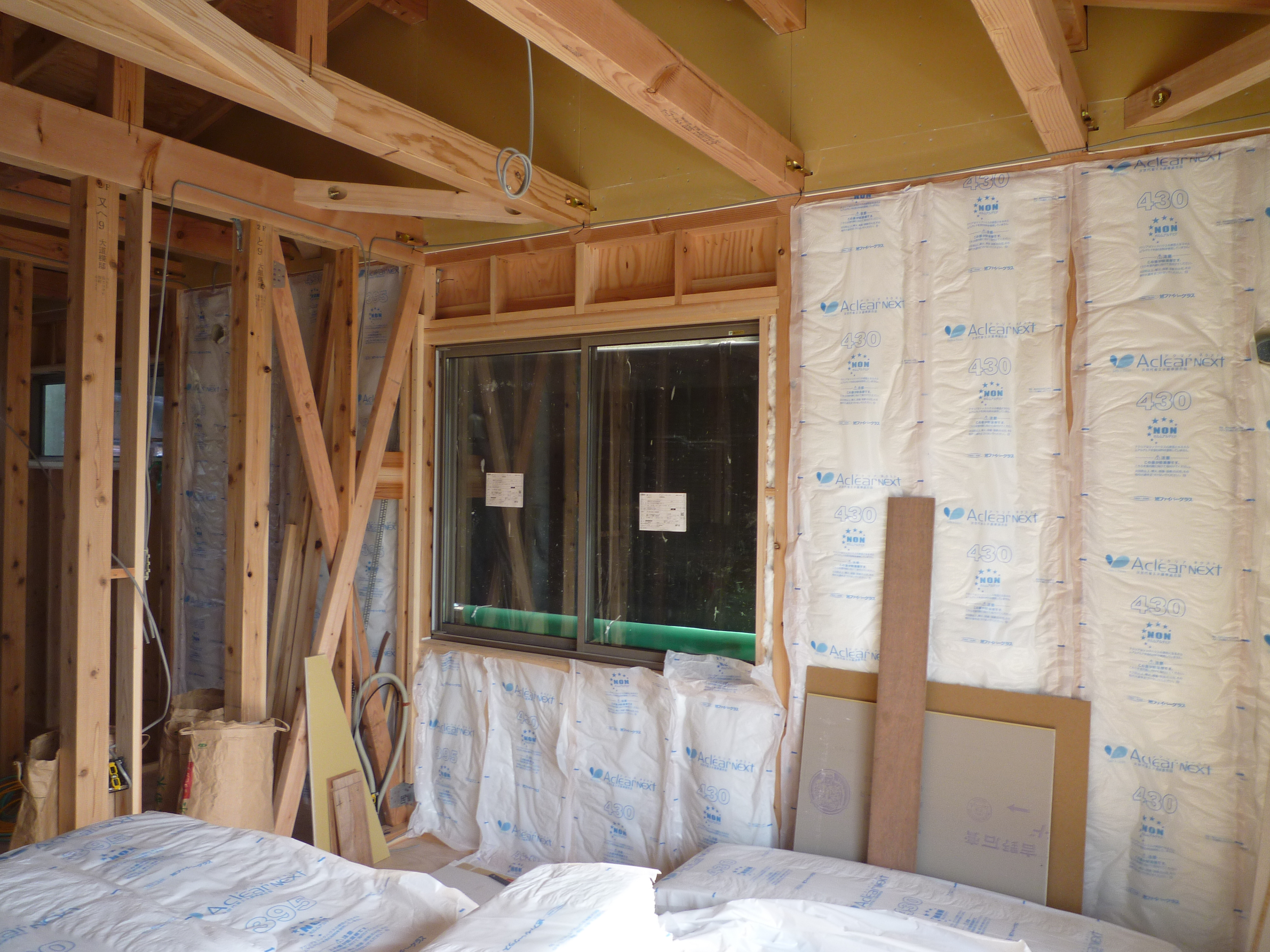 京都市・西東町での住宅の工事が順調に進んでおります。当事務所では省エネ等級4が確保できる高性能グラスウールを標準仕様としております。断熱材の縁が木材部にしっかりと重なるように。ヘタリや充填不足がないかを確認していきます。