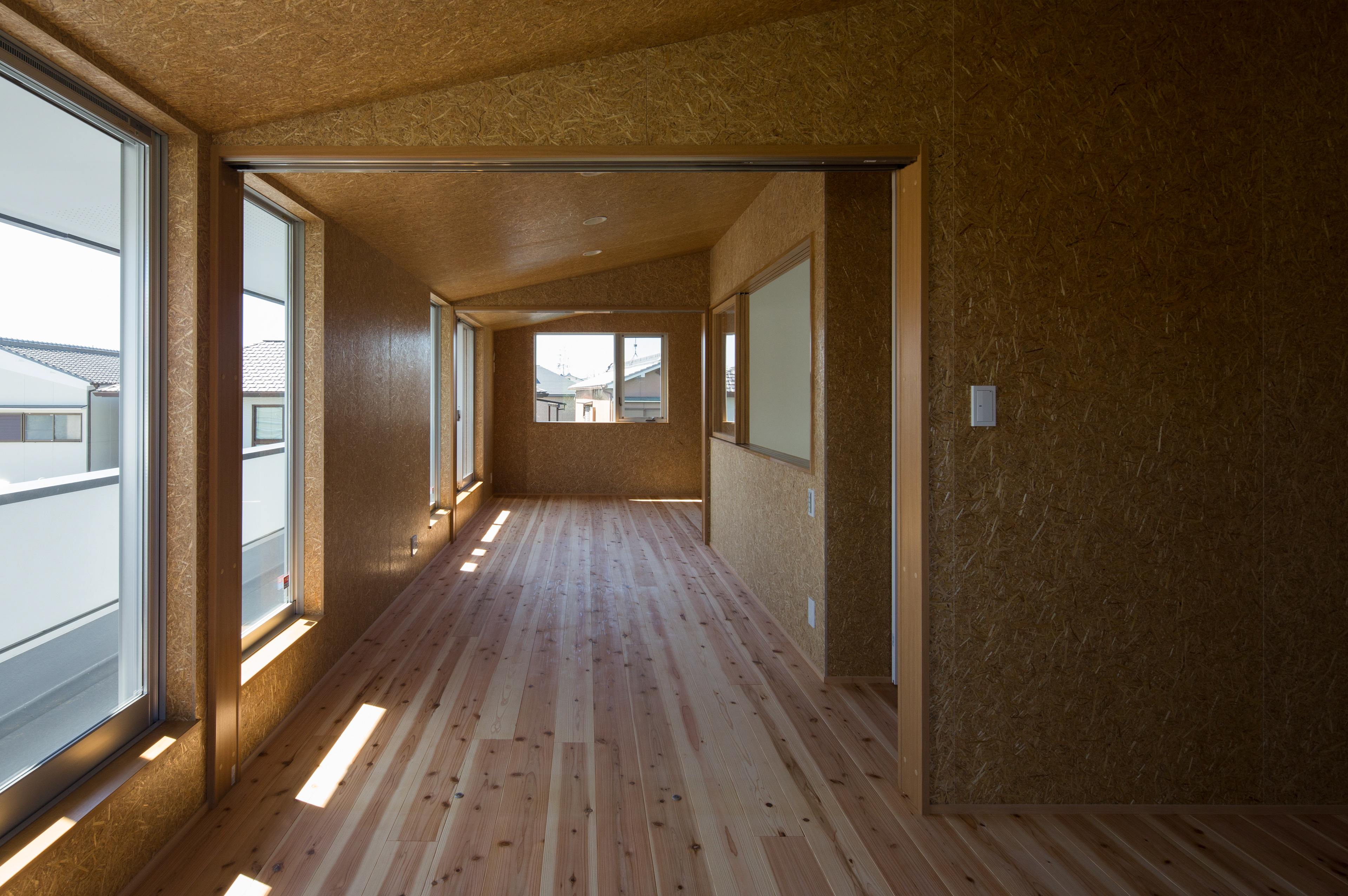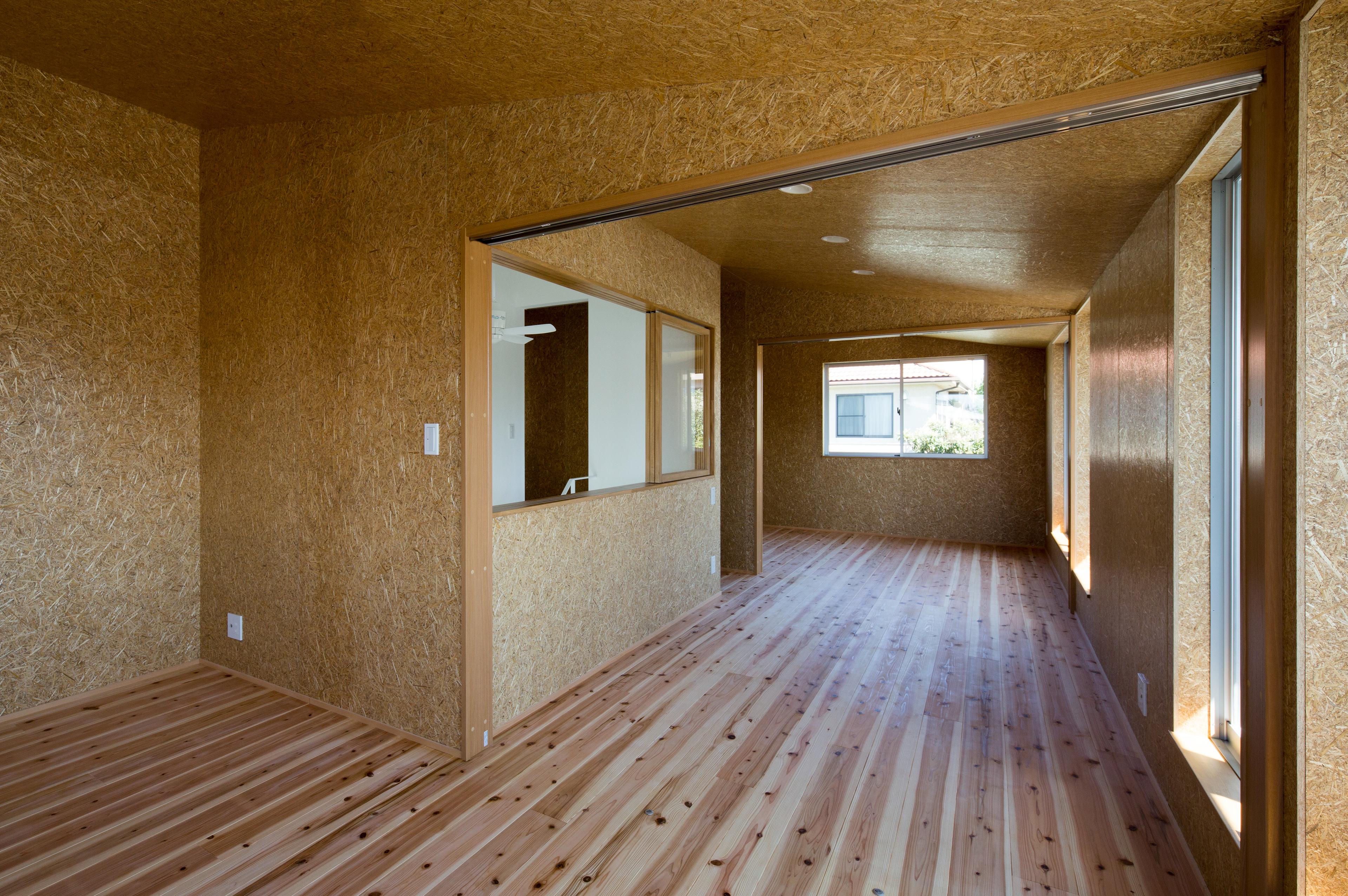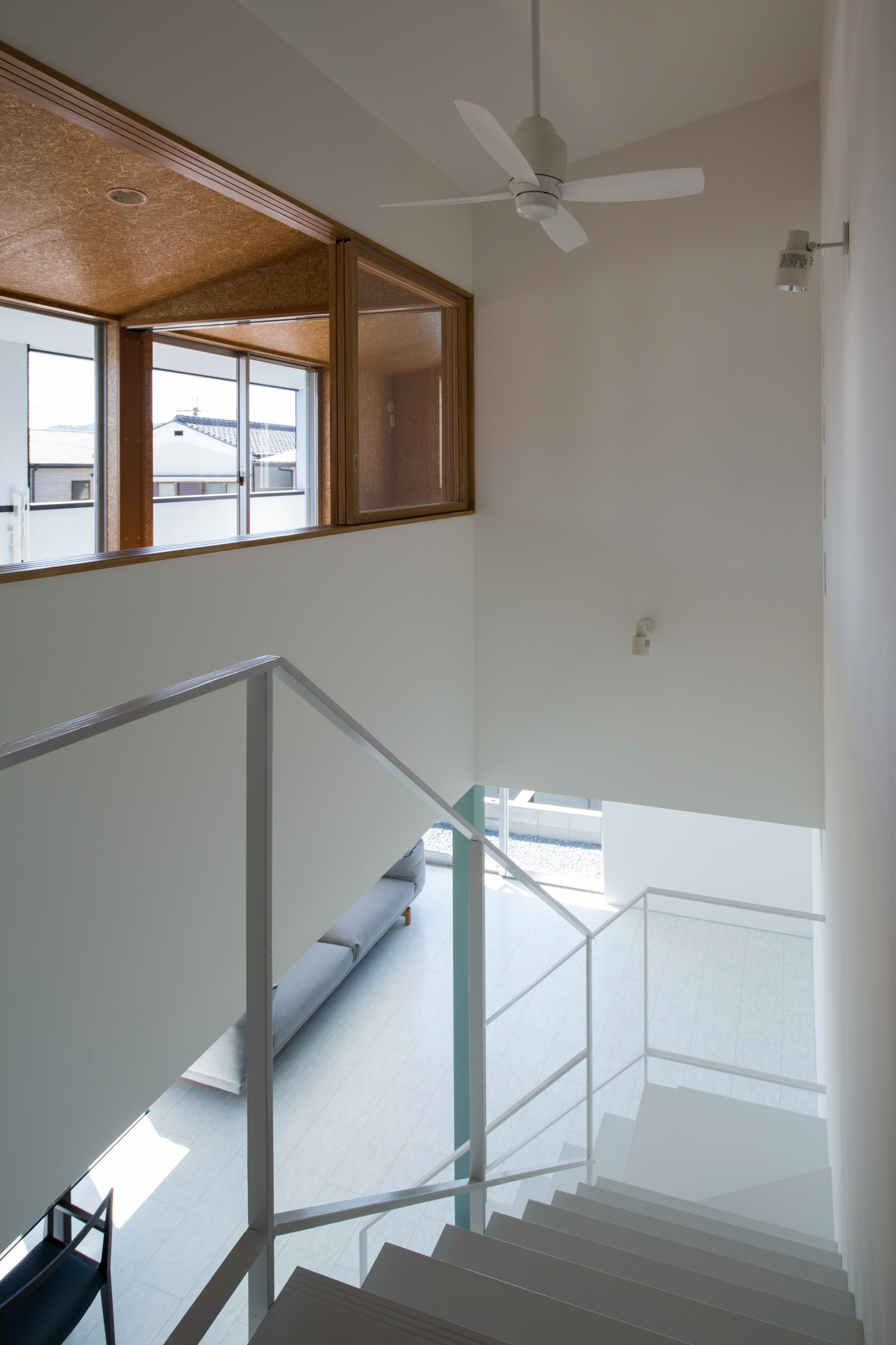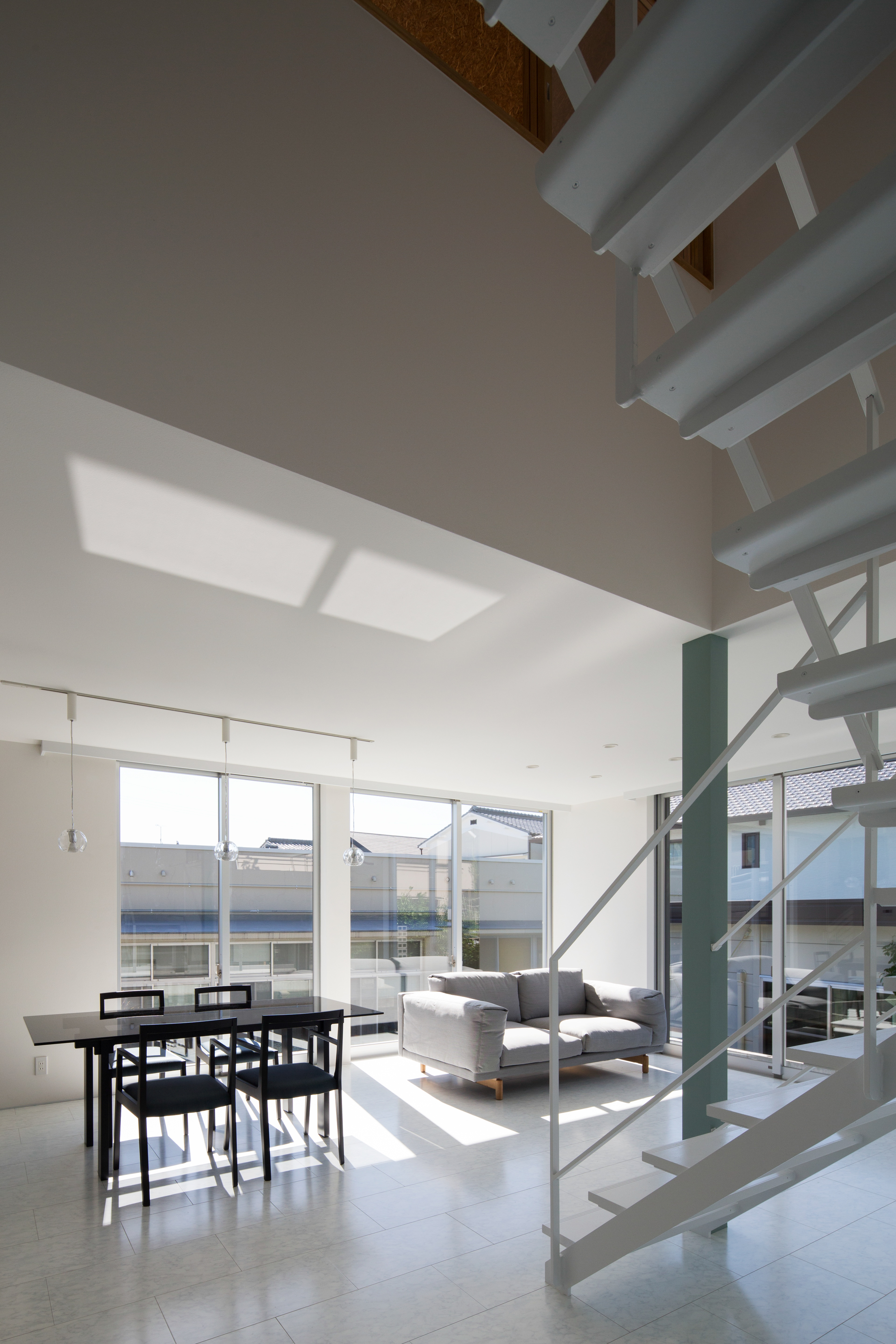 大山崎町は京都府南部の大阪府との県境に位置し、淀川と天王山の山裾が迫る極めて狭小な地域です。この土地は旗竿敷地。街道から少し奥まった位置にこの建物は建っています。クライアントからの要望は、太陽光発電パネルがめいいっぱい載せる事ができる屋根を持つこと。1階は木目を感じないモダンな白い空間をつくること。温熱環境やメンテナンスに配慮した建物であること。まず太陽光パネルを多く載せるため、総2階建て、かつ、軒先を大きく跳ね出した上で屋根面を日当たりの良い東南側に向け、一番発電効率が良い2寸勾配を持った片流れの屋根としています。外壁は、黒色の砂状左官仕上塗材、黒色に塗装されたヒノキ板張り、グレー色のボーダータイル張りで作られ、歴史ある街道沿いの町並みに配慮しながら和モダンな雰囲気を作り出している。内部空間は、白壁とステンレス製のオープンキッチン、淡いグリーンがワンポイントとなっているシースルー階段で構成されたシンプルで光が反射するスタイリッシュな空間である1階と、麦わらを圧縮圧着しボード状に成形された「ハーベストパネル」と杉板フローリングといった自然素材で構成された優しさを感じる2階、それらを繋ぐ吹き抜けで計画しています。